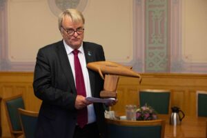 Tredje visepresident Ove Trellevik (H) med vandrehvalen Jarle Kval.