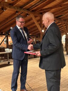 Bok nr. 1 blei overrekt frå konsernsjef Rikard Toft Ledang til styreleder og grunder Jarle Vindenes på årets julebord.